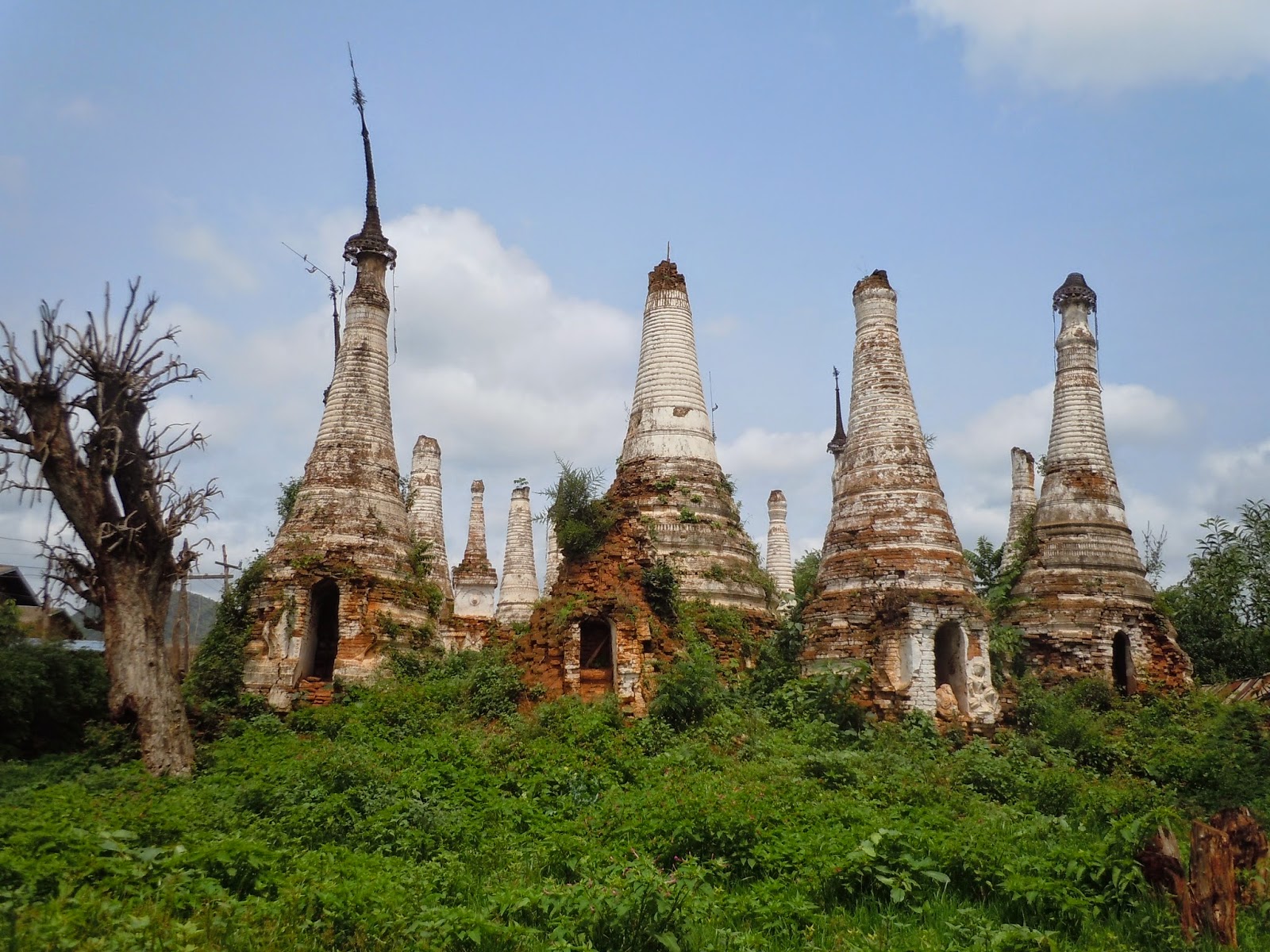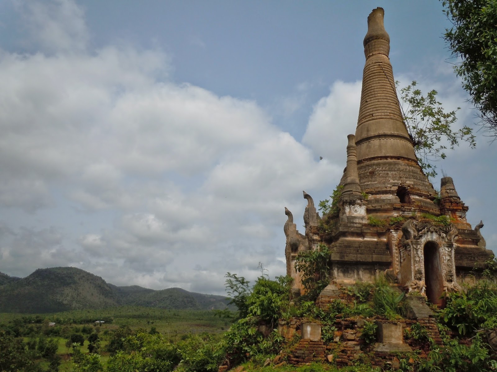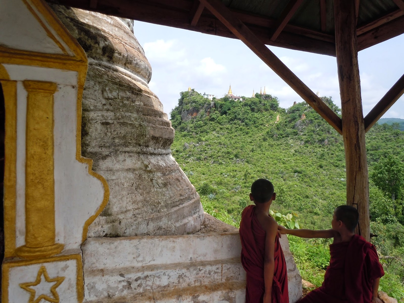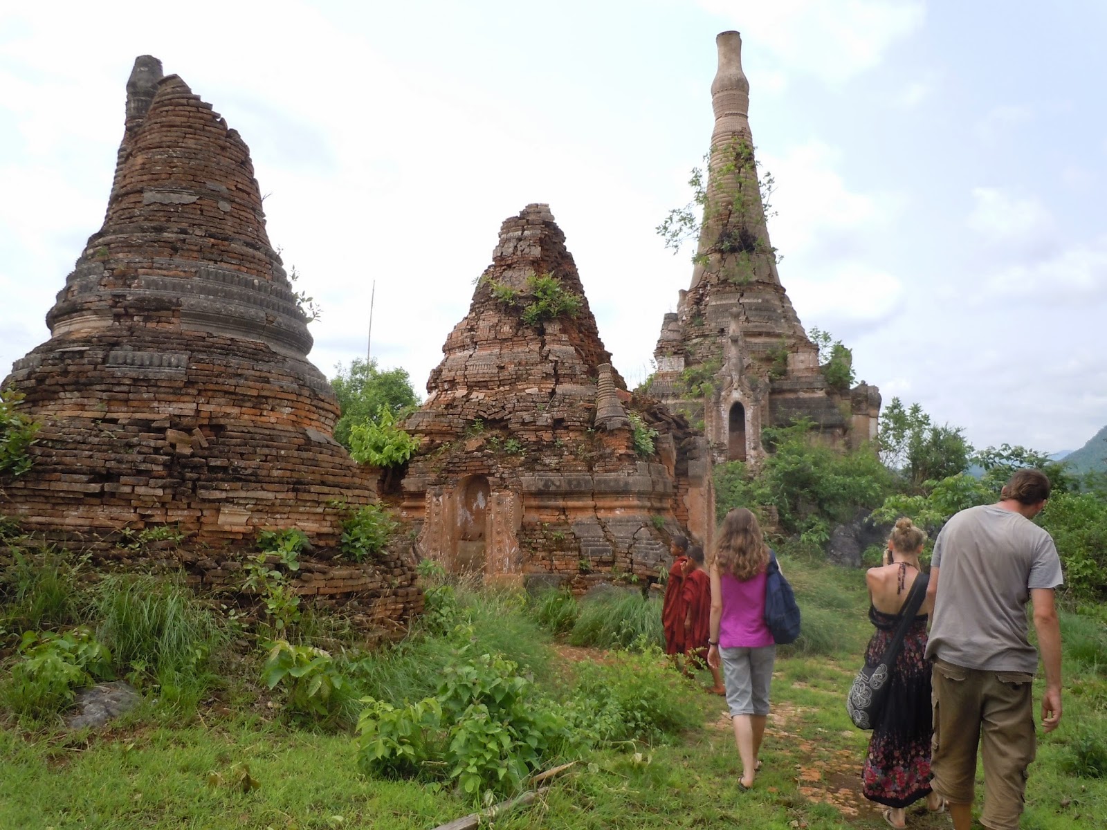 There's talk of some nearby stupas that are supposed to be worth a look, so we go off in search of them with the help of some child monks. The stupas have been completely overgrown with green shrubbery, the white paint weather-beaten and exposing the brown clay brick underneath. A pretty good photo op.